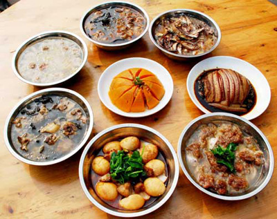 如果說靖港的吃名聞遐邇,有口皆碑,那么,八大碗則是靖港吃之翹楚,也是古鎮(zhèn)人引以為榮的傳統(tǒng)名牌。從前靖港街上數(shù)十家有名餐館,都把八大碗當作各自的招牌菜,各餐館的廚師也都是潛心研習(xí),精益求精,把烹制出高水平的八大碗當作看家本領(lǐng)。曾經(jīng)繁榮昌盛的“小漢口”靖港,那些停船上岸的船夫,載貨而來的生意人以及慕名而來的浪人,首先就得進餐館吃八大碗,飽其饞吻,享其口福,乃至為了貪吃八大碗而“船到靖港口,順風(fēng)也不走。”而靖港街上的紅白喜事,也是非八大碗不成宴席。