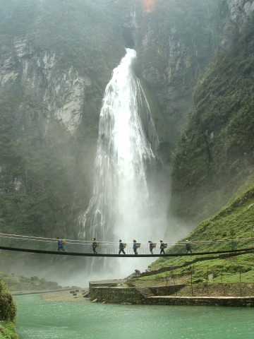 瀑水從斧削狀絕壁上的溶洞奪口噴出,飛流直下,聲如霹靂,數(shù)里可聞,整個(gè)山谷煙云彌漫,霧氣蒙蒙,遠(yuǎn)看瀑布如白練懸空,近看似銀河瀉天際。每當(dāng)陽光照耀時(shí),五光十色的浪花似彩虹凌空飛舞,艷麗奪目,蔚為壯觀。瀑高214m,建有一電站。
