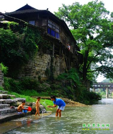 民宅多為吊腳木樓,依山傍水而建,臨河者倒影澄潭如水中街市,依山者雄峙高崖似空中樓閣。兩條河潔凈透亮,其中小河尤為美麗,青山夾岸,綠水長流,河畔蓼紅芷白,桂馥蘭芳,素有“香溪”之稱。其水盡來自溶洞,距街三里之內(nèi),就有魷魚洞、犀牛洞、王家洞、向家洞幾股洞泉和一個(gè)叫“雞屎潭”的溫泉。 “雞屎潭”來有濃重的硫磺味,水溫如沸,除污力極強(qiáng),根本不需肥皂便能將汗?jié)n洗得干干凈凈,并能醫(yī)治瘡疥,維護(hù)皮膚健康。河中多魷魚,肉嫩且肥,立冬前盡逆水潛入溶洞起冬,立夏前兩三天則成群結(jié)隊(duì)隨夏汛而出,鄉(xiāng)人在洞口安上網(wǎng)壕,只需“守株待兔”,便能得到豐盛的收獲。在20世紀(jì)70年代以前,有時(shí)每天可得幾百斤。 小河灘多流急,是漂流的極佳去處。