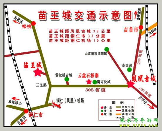 2、銅仁方向:自銅仁火車站往湖南方向經(jīng)過銅仁鳳凰飛機(jī)場(chǎng)附近(20公里處)、三岔路(23公里處)、蔬菜基地百合基地(26公里處)、中國苗王城牌樓(30公里處)、苗王茶園(30公里處)、苗王城生態(tài)農(nóng)業(yè)觀光點(diǎn)(桃林、金果林)、苗王城停車場(chǎng)售票處(33公里處)。