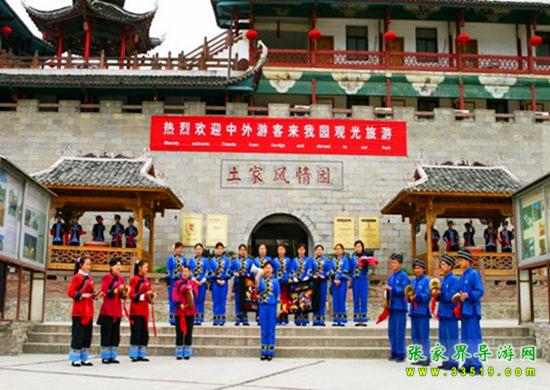 土家風(fēng)情園座落在張家界市內(nèi),占地5公頃多,是一座人文景 觀與自然景觀相融合,集旅游觀光、文藝表演、奇珍展覽、住宿、娛樂(lè)、購(gòu)物等于一體的大型綜合性旅游服務(wù)企業(yè)。其主要由土家建筑群落、民風(fēng)民俗展示、文藝表演、客房、餐飲、大型狩獵場(chǎng)、珍稀植物園、根雕基地等功能區(qū)構(gòu)成。園內(nèi)建筑多為木石結(jié)構(gòu),雕梁畫(huà)棟,金碧徽煌、飛檐翹角 、玲瓏雅致。2001年4月,國(guó)務(wù)院總理朱镕基入園視察并給予很高的評(píng)價(jià)。2002年9月,由一千人參加表演的千人毛古斯舞蹈活動(dòng)在園內(nèi)舉辦并獲得圓滿成功,千人毛古斯和九重天吊腳樓同時(shí)被列入世界吉利斯記錄。2004年1月,土家風(fēng)情園被評(píng)為國(guó)家4A級(jí)旅游區(qū)(點(diǎn))。