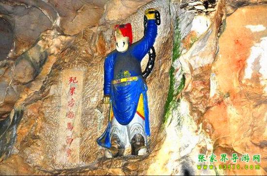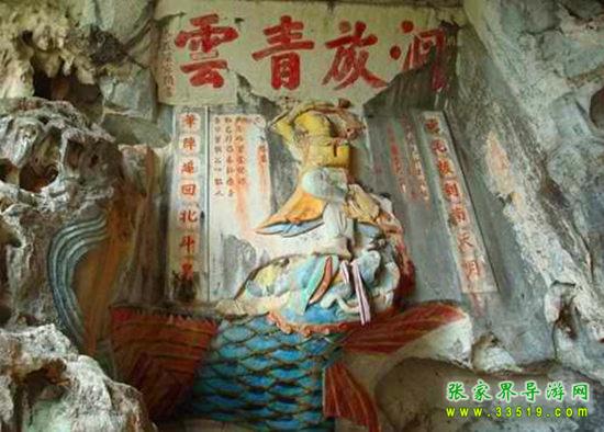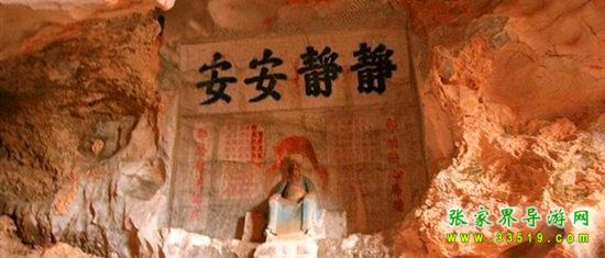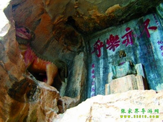 玉皇洞石窟位于張家界城西約7公里的麻空山南壁,為清代本地鄉(xiāng)紳李京開獨(dú)資捐修。李京開又叫李五瑞,別名九洞樂,號(hào)識(shí)破生。他生于乾隆七年(公元1742年),道光乙酉年(1825年)去世,享年83歲。李先生家道殷實(shí),富甲一方。少時(shí)勤奮讀書,頗有才華,數(shù)十年奔波仕途,但屢試不第,官場(chǎng)無望,于是看破紅塵,另尋安慰,請(qǐng)工匠,耗巨資,憑借麻空山天然溶洞,按上、中、下方位布局,巧妙構(gòu)思,開鑿成“天堂”、“人間”、“地府”三層共八個(gè)洞。另外,在離此約3公里的峰泉洞另鑿一洞,故有“九洞樂”別名。玉皇洞石窟上層為玉皇洞,人間層有玉金洞、毫筆洞、墨池洞、虎龍洞、雄獅洞、孔圣洞,地府為因果洞,八洞組成一個(gè)完整的混沌世界。居八洞之首的玉皇洞,雕有玉皇大帝神像,意為“天堂”至尊,統(tǒng)帥中層的“人間”和下層的“地府”,故八洞統(tǒng)稱玉皇洞。此洞于1799年動(dòng)工,到1807年完成,歷時(shí)八年。洞內(nèi)雕鑿了一些歷史人物的神像以及大量詩詞匾對(duì),不僅石雕精湛獨(dú)特,雕像神韻生動(dòng),書法遒勁大氣,而且在石窟藝術(shù)的主題構(gòu)思上,抒發(fā)了主持捐修者李京開懷才不遇、憤世疾俗、向往太平盛世的情感,鞭達(dá)了腐朽的科舉制度,對(duì)于研究清代社會(huì)和科舉制度,以及當(dāng)時(shí)一般讀書人的思想情感,都具有一定的史料價(jià)值。整座洞窟東西長300余米,現(xiàn)存石像19尊,石刻50多處,是湖南省唯一保存完好的石窟藝術(shù)群,1959年玉皇洞被列入湖南省重點(diǎn)文物保護(hù)單位。