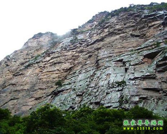 位于插旗峪正中右側(cè)。一石壁從溪邊橫空而起,頂天立地,高約300米,長(zhǎng)約800米。仰望崖壁欲墜,通壁無掛,醫(yī)理清晰,棱角分明,強(qiáng)健雄渾,銳不可擋。壁前一谷攔泡,空靈清幽。又岸數(shù)峰相對(duì),俯首揖拜。立于板栗山山頂繚望,此堅(jiān)如一孺獸,昂首夾尾,豪氣奪人。