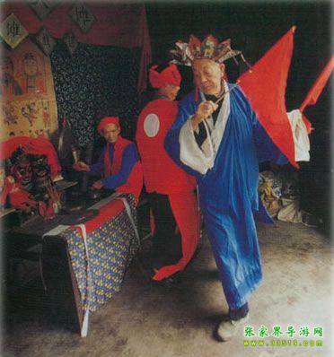 早期,作為一種“神堂戲劇”,祖神生活的再現(xiàn)方式不能不受神堂環(huán)境的制約,土家族儺戲在演出方式上比其它劇種的演出更有原始的意蘊。在清末民初,《搬鐵匠》為獨角戲,演出時先唱儺堂見聞,再唱山歌。繼而打鐵,然后將打好的板斧交給開山后退場。從本世紀二十年代起,這折戲發(fā)展為丑、旦對子戲。鐵匠夫妻開爐打鐵,表演滑稽,并相互戲謔,如鐵匠叫:“打頭”,其妻以扇擊夫頭,鐵匠叫“打尾”,其妻以扇打夫腿等。在儺戲中,這類詼諧、表演性強的劇目比比皆是。儺戲一般都是在主人家堂屋演出,不搭臺,三面向觀縱,時空虛擬。演出場地正中靠神壁處,置一方桌,桌子兩旁坐樂隊,樂隊一般由三、四人組成,打鑼的相當于節(jié)目主持人。儺戲在表演藝術方面比較簡單,旦角由男性演員扮演,有一定的表演程式,角色一般是先背向觀眾由上場門后退出場,待介紹性的唱段唱完后才轉過身來。更重要的是,土家族儺戲面具的特色,它既保存了古代儺面的顯著特征,差、兇與正、丑形象臉譜化,同時廣泛地吸取了兄弟戲劇藝術的養(yǎng)料。它那輕松的氣氛、動人的歌舞、樂觀的情趣,表現(xiàn)了和諧的生活美,也使儺戲演出更加生氣盎然。