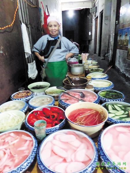 鳳凰本地人介紹好吃的,總是推薦姜糖、獼猴桃等,事實(shí)上,當(dāng)?shù)匦∠锷钐幍呐莶送瑯恿畈簧儆慰唾澆唤^口。酸酸的泡菜可以是豆角,也可以是當(dāng)?shù)靥赜?的紅心蘿卜、刀豆、包菜、涼薯等,這些都可以成為泡菜原料,每種原料用陶缽盛著擺在架子上。想吃什么,自己用筷子夾了放一起。過(guò)完秤,可以根據(jù)自己的喜好 放辣椒粉或白糖拌(辣椒粉還分微辣、猛辣),往旁邊小桌上坐下,邊吃邊看著古街上那些匆匆而過(guò)的游客,那種感受絕不亞于在國(guó)外街頭喝咖啡賞景。