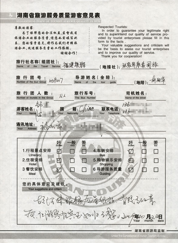 2009年10月17日福州鄒先生一行12人接待質(zhì)量反饋單:
