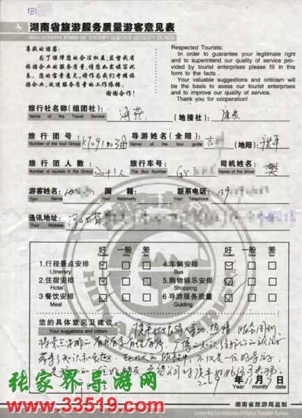 2009年11月3日河北田先生一行20人旅游接待質量反饋單: