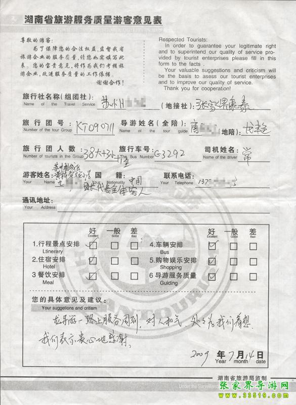 2009年7月14日蘇州尤女士一行41人質(zhì)量接待反饋單:
