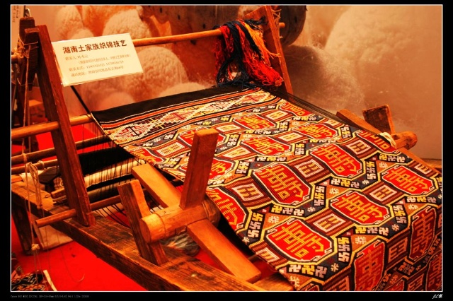 土家織錦的歷史悠久。早在漢代,它就初露頭角?!逗鬂h書.西南蠻夷傳》記載,“武陵蠻織績(jī)木皮,染以草,衣裳斑斕……”清同治年間編修的《永定縣志》也說(shuō):“土錦績(jī)五顏經(jīng)線為之,文彩斑斕可愛,使用以為被,或作衣裙,或作巾,故又稱‘筒巾’。”